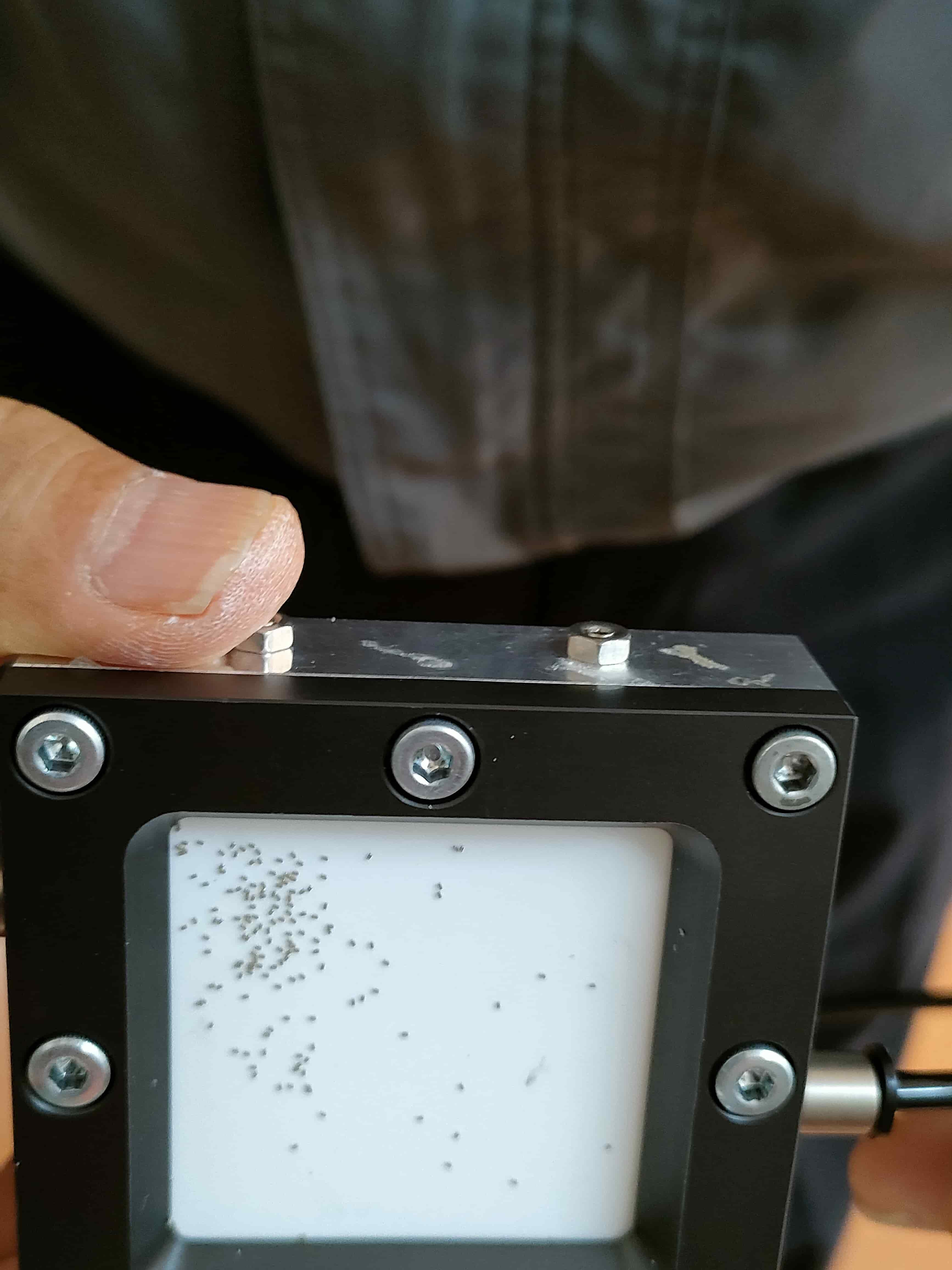 8.計数機(パーツカウンター) 極微小なサイズのワークの数量を、高速で正確にカウント可能 な正圧ポーラスステージ。ワークは振動に依らず、浮きながら 多列のV溝を滑って下降 | ![]() |